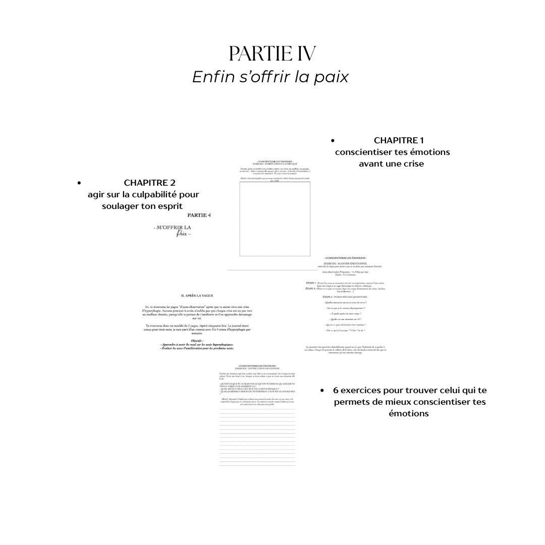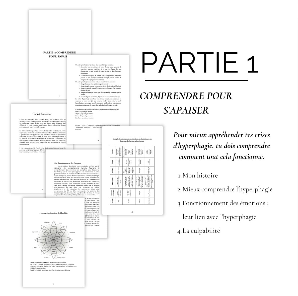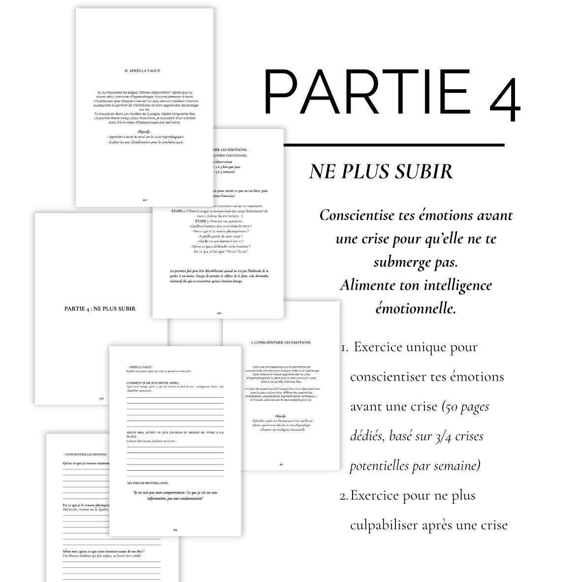 - Première partie : exercice unique avec différentes questions pour conscientiser ton émotion lorsque celle-ci peut t’amener vers un accès hyperphagique. Exercice disponible 50 fois, sur une moyenne de 3 à 4 crises d’hyperphagie par semaine, soit un besoin d’extérioriser ton émotion autant de fois. 6 exercices supplémentaires pour conscientiser tes émotions et trouver celui qui te correspond le mieux.