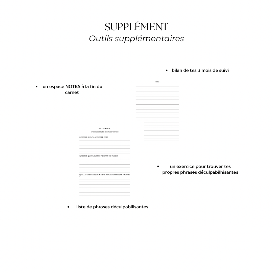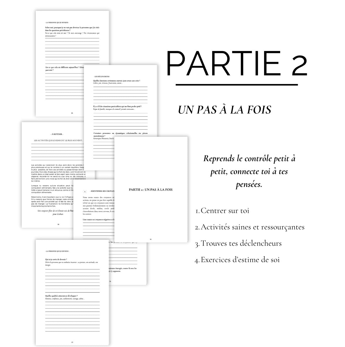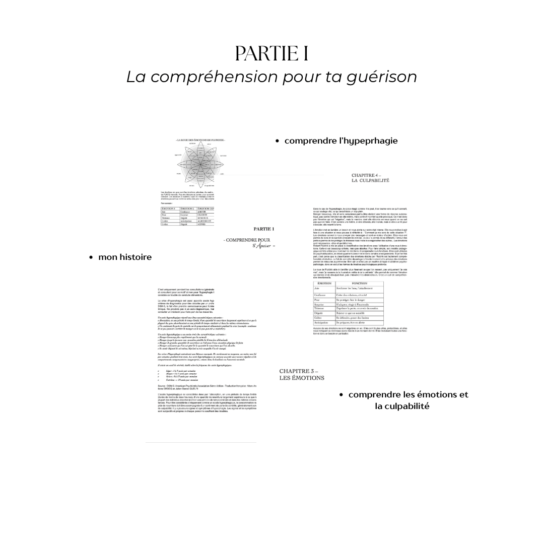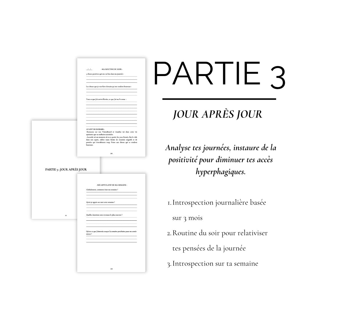 - Deuxième partie : pages d’auto-observation après un accès hyperphagique, pour t’améliorer et en apprendre davantage sur ta crise d’hyperphagie, et surtout de ne pas culpabiliser. C’est donc un modèle composé de plusieurs questions, répétés 50 fois.