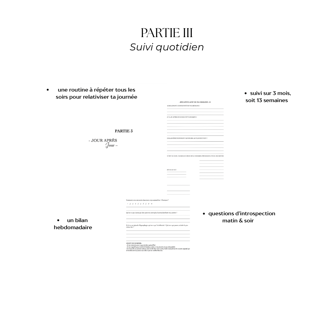 Chaque jour, démarre ta journée et fais une introspection le soir sur ton état émotionnel. Créer ta propre routine du soir pour favoriser un état d’esprit serein. Basé sur 13 semaines, soit 3 mois, avec un bilan à la fin de chaque semaine pour témoigner d’une véritable évolution.